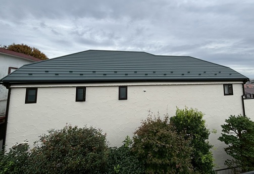 I様 このたびはご契約頂き、さらにはお客様アンケートとGoogle口コミをご投稿くださいましてまことにありがとうございました。外壁はペーフェクトトップND-503で塗装を、屋根はシェイドモスグリーンのガルバ材でカバー工事を施工させていただきました。